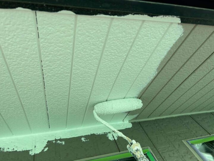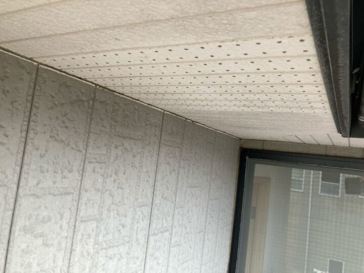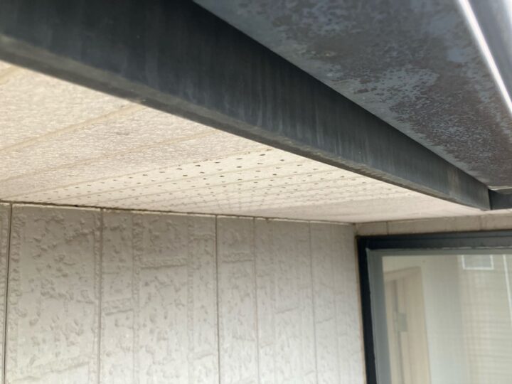 軒天部分にカビが見受けられます。今回、防カビ成分の入った軒天専用塗料を塗布することで素材を長持ちさせることができます。 -