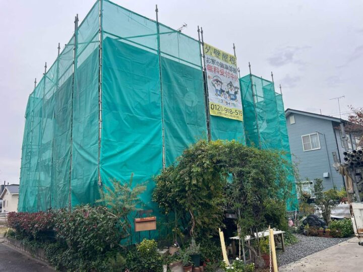 足場の組立・メッシュシートの取付が完了しました。安全且つご近所様への配慮になります。 -