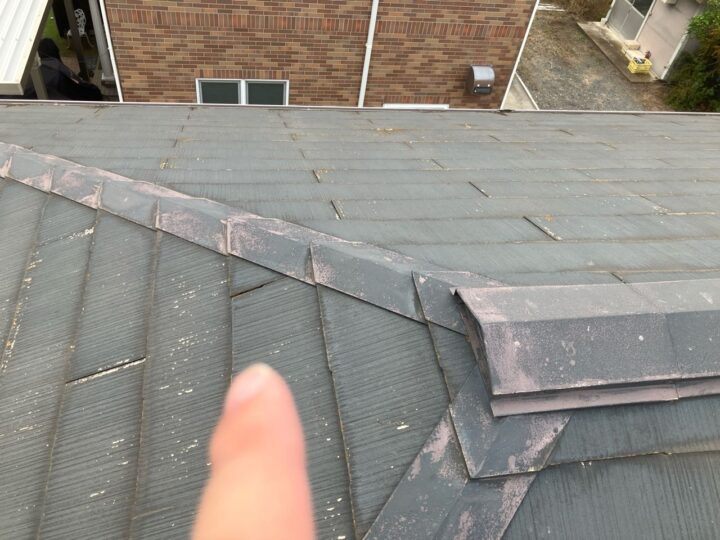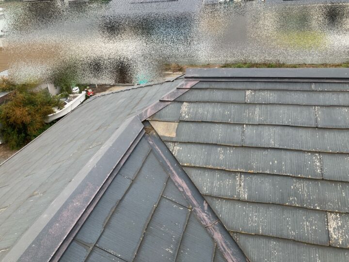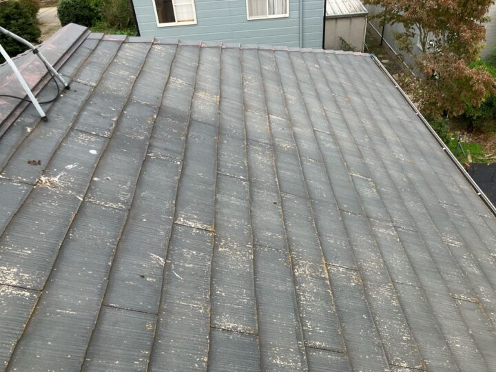 既存屋根材はスレート屋根です。石質の薄い板を使用しているため、劣化や反りがしやすい材料です。表面の塗膜が剥がれだしております。 -