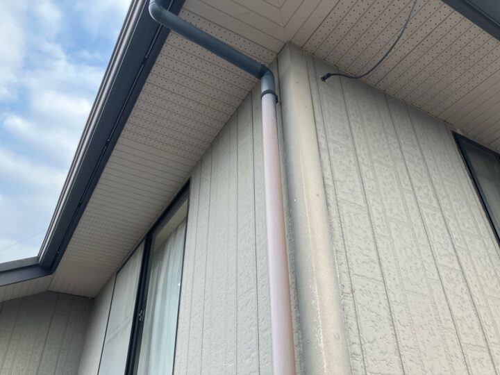 雨樋の褪色が見受けられます。今回、外壁と併せて塗装をすることで素材を長持ちさせることができます。