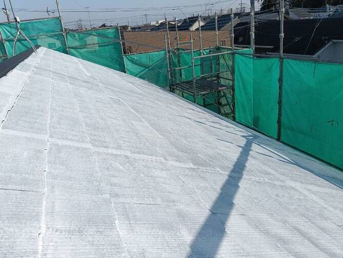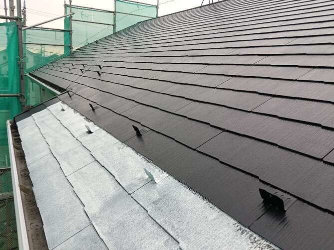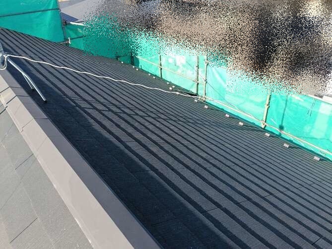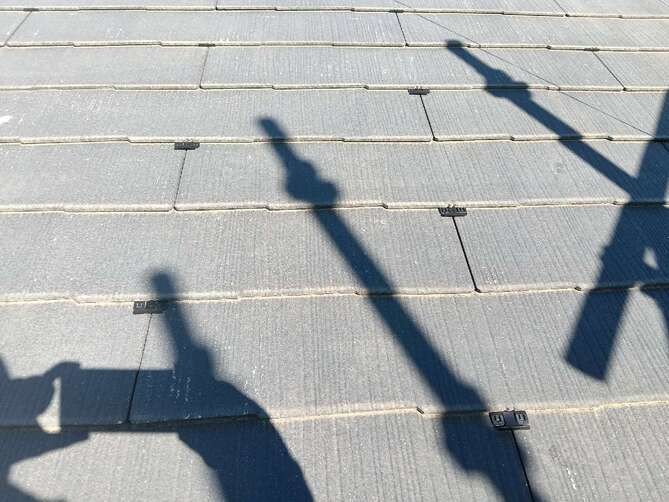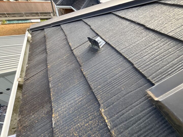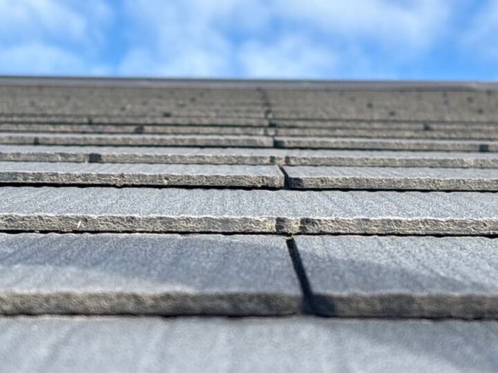 既存屋根材はスレート屋根です。石質の薄い板を使用しているため、劣化や反りがしやすい材料です。 -