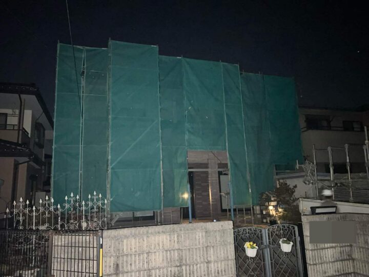 足場の組立・メッシュシートの取付が完了しました。安全且つご近所様への配慮になります。 -