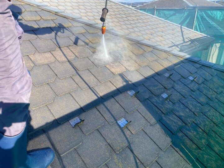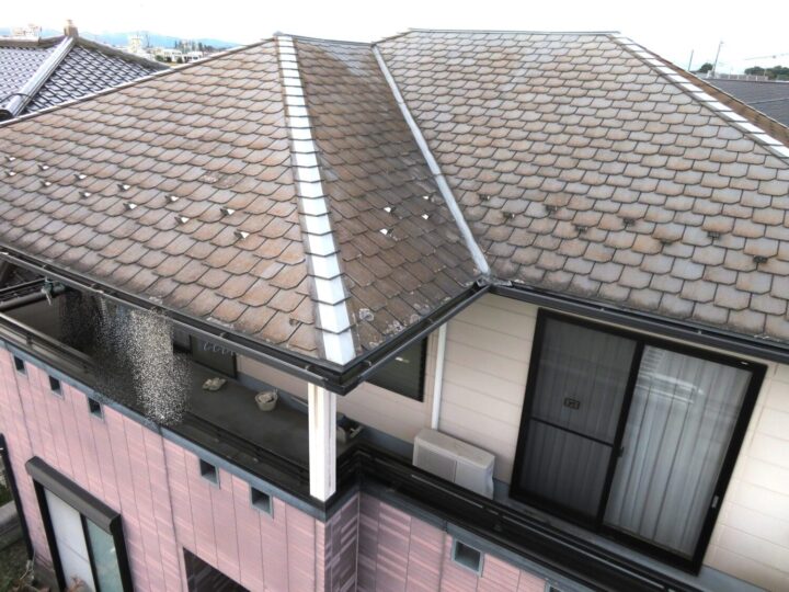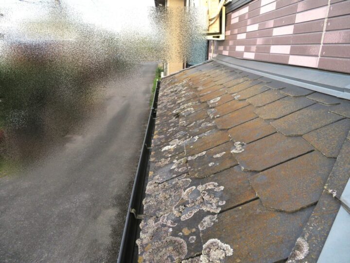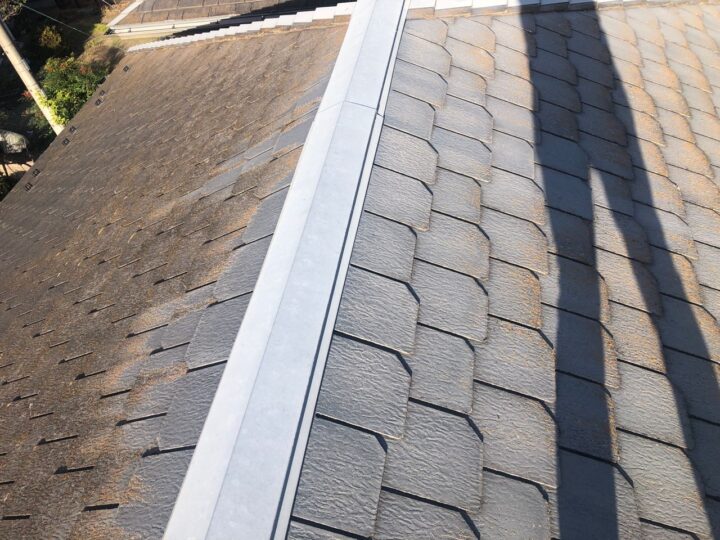 既存屋根材はスレート屋根です。石質の薄い板を使用しているため、劣化や反りがしやすい材料です。 -