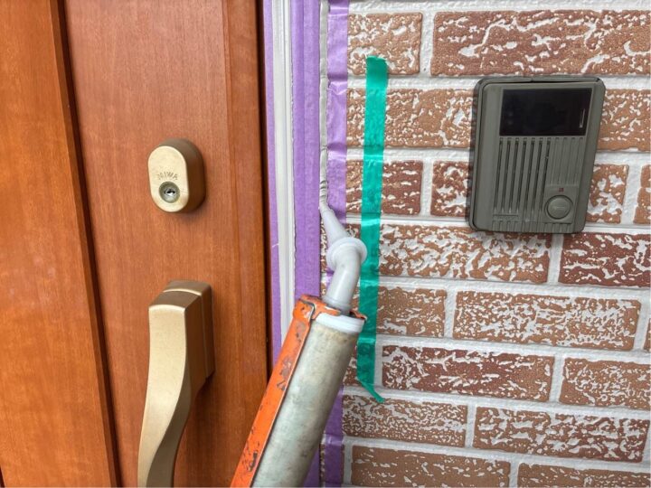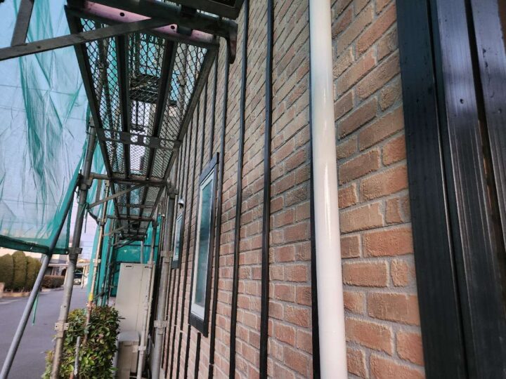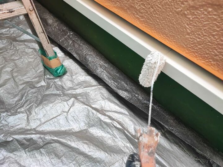 基礎水切りのチョーキングが見受けられます。今回外壁カバー工事施工の場合新規の水切り材となります。