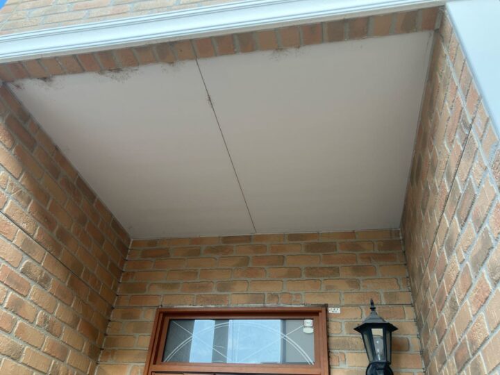 軒天部分にカビが見受けられます。今回、防カビ成分の入った軒天専用塗料を塗布することで素材を長持ちさせることができます。 -