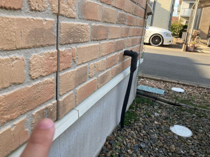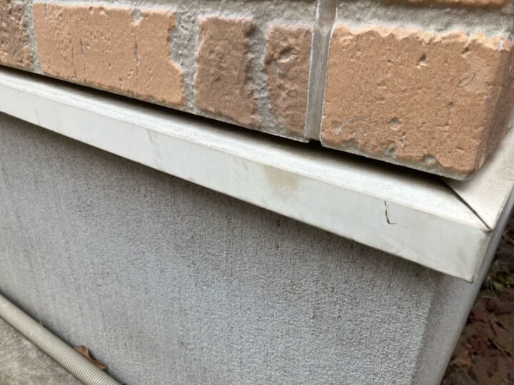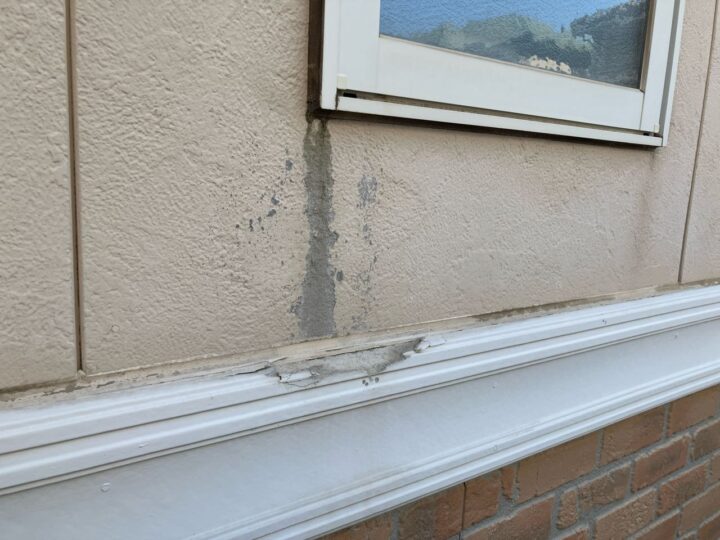 基礎水切りのチョーキングが見受けられます。今回外壁カバー工事施工の場合新規の水切り材となります。