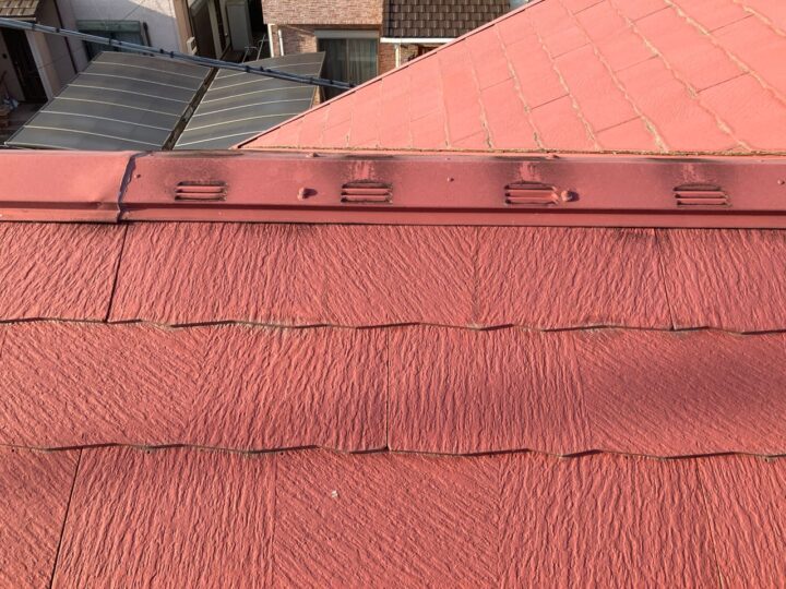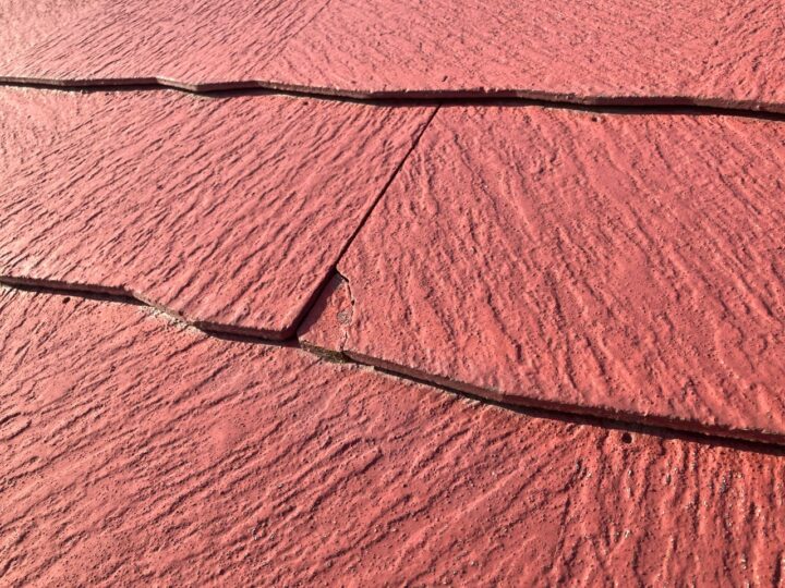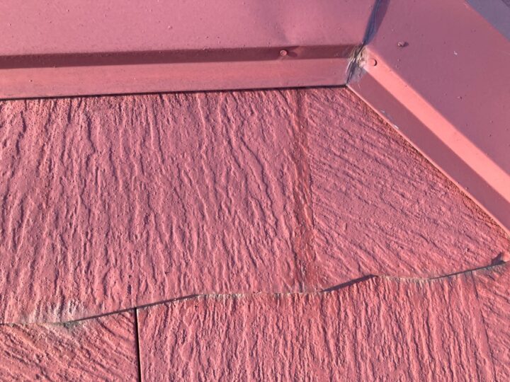 既存屋根材はスレート屋根です。石質の薄い板を使用しているため、劣化や反りがしやすい材料です。また、レサスエコシンプル自体が塗装不向きとされている屋根材の為、今回塗装では長持ちさせられないと判断します。※直ぐ割れる可能性がある為。 -