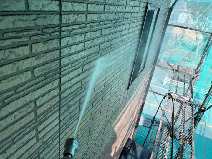 外壁の洗浄作業を行っています。 -