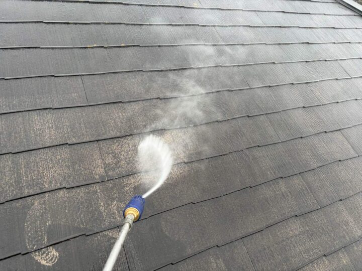 屋根の洗浄作業を行っています。 -