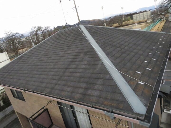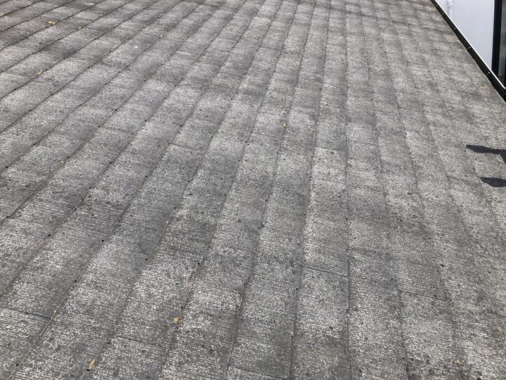 既存屋根材はスレート屋根です。石質の薄い板を使用しているため、劣化や反りがしやすい材料です。 -