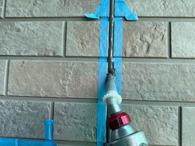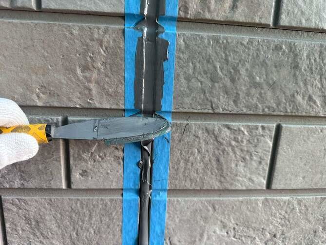 マスキングテープを張り、プライマー処理しシーリングの充填を行っています。 -