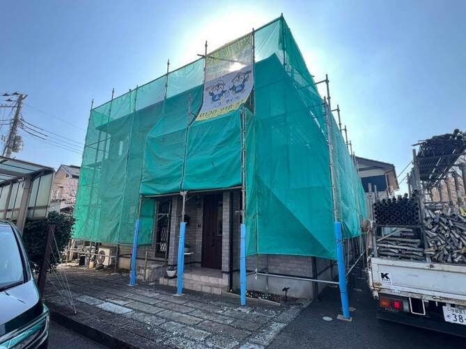 足場の組立・メッシュシートの取付が完了しました。安全且つご近所様への配慮になります。 -
