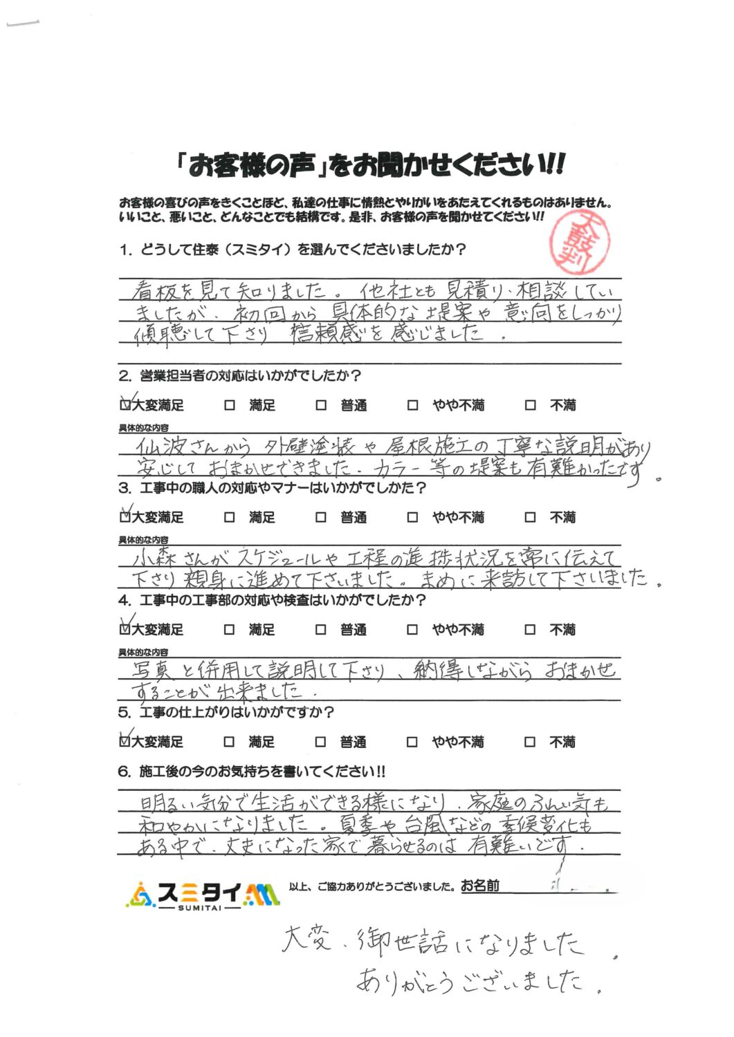 明るい気分で生活ができる様になり、家族のふんい気も和やかになりました。夏季や台風などの気候変化もある中で、丈夫になった家で暮らせるのは有難いです。大変御世話になりました。ありがとうございました。
