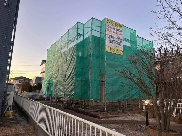 足場の組立・メッシュシートの取付が完了しました。安全且つご近所様への配慮になります。 -