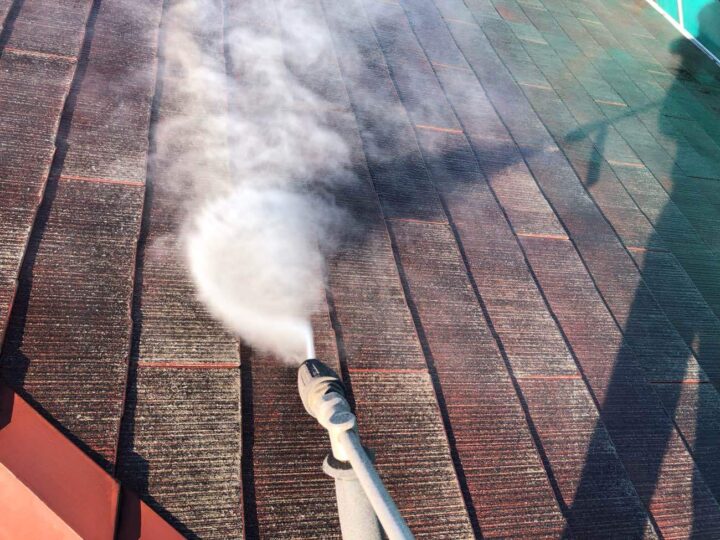 屋根の洗浄作業を行っています。 -