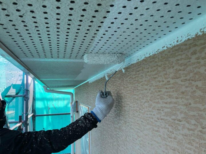 軒天の下塗りを行っています。 -