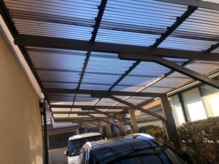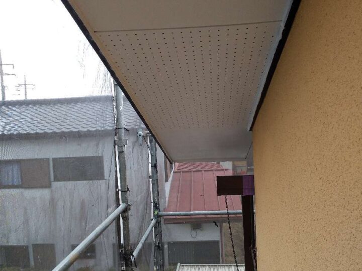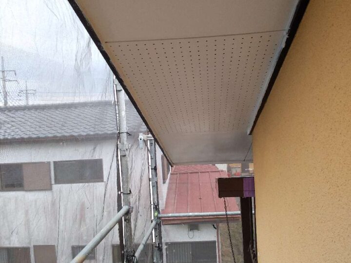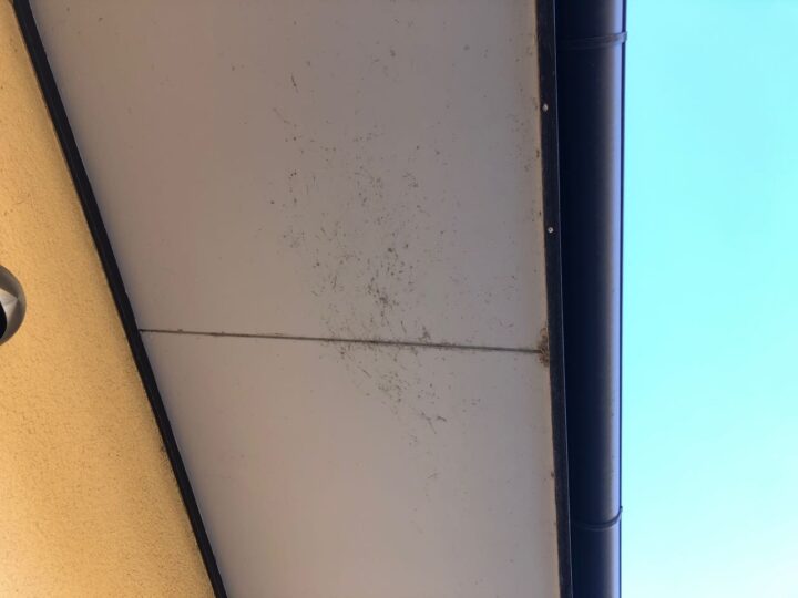 軒天部分にカビが見受けられます。今回、防カビ成分の入った軒天専用塗料を塗布することで素材を長持ちさせることができます。 -