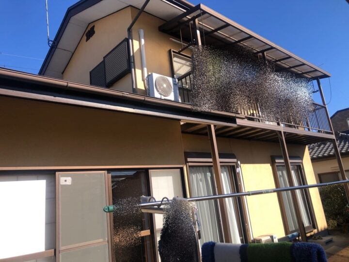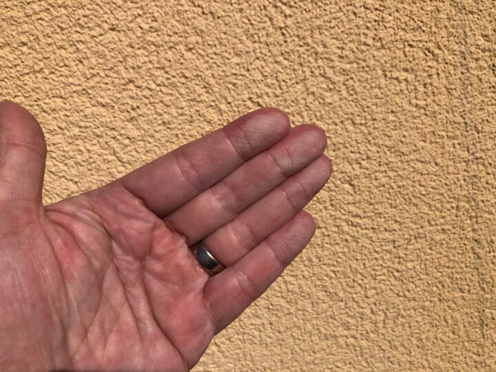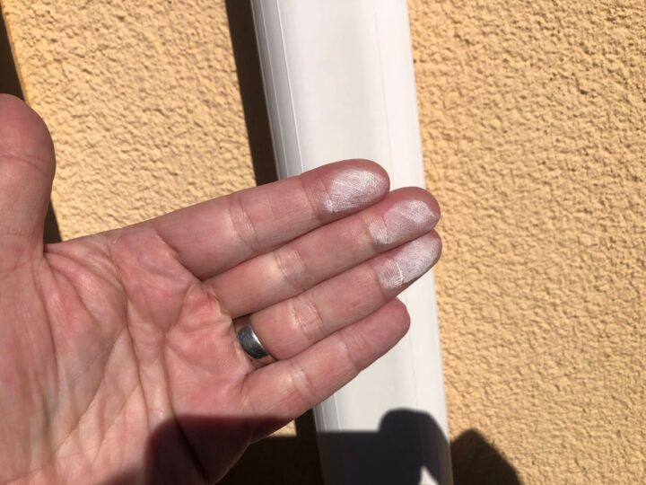 紫外線による影響から、塗料の劣化を示すチョーキングが発生しております。しっかりと高圧洗浄で汚れを落とし、塗装をする必要があります。 -